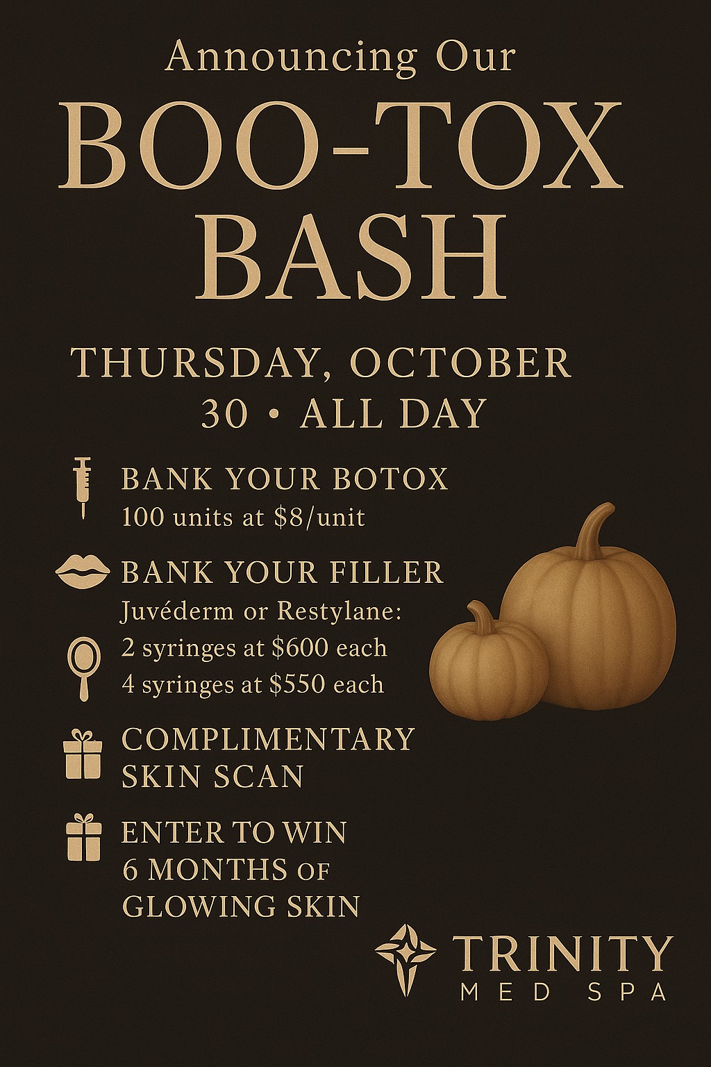 Disclaimers: Offers valid on October 30, 2025, only, while supplies last. All treatments are subject to a medical consultation to confirm eligibility. Pre-purchased treatments must be scheduled and completed following a consultation. Filler offer excludes Restylane Contour. Botox and Filler offers are with Hannah only. Banked products are non-refundable and must be used within one year of purchase. Cannot be combined with other non-event promotions or discounts.